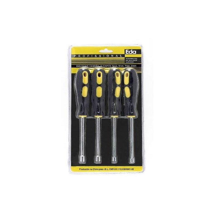 O jogo com quatro chaves canhão da Eda possui cabo antideslizante, emborrachado e ergonômico, lhe garantindo maior segurança e firmeza ao utilizar as chaves.
