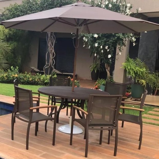 Jogo de mesa com 6 cadeiras em alumínio e tela sling modelo Acelga e Guarda Sol com base.