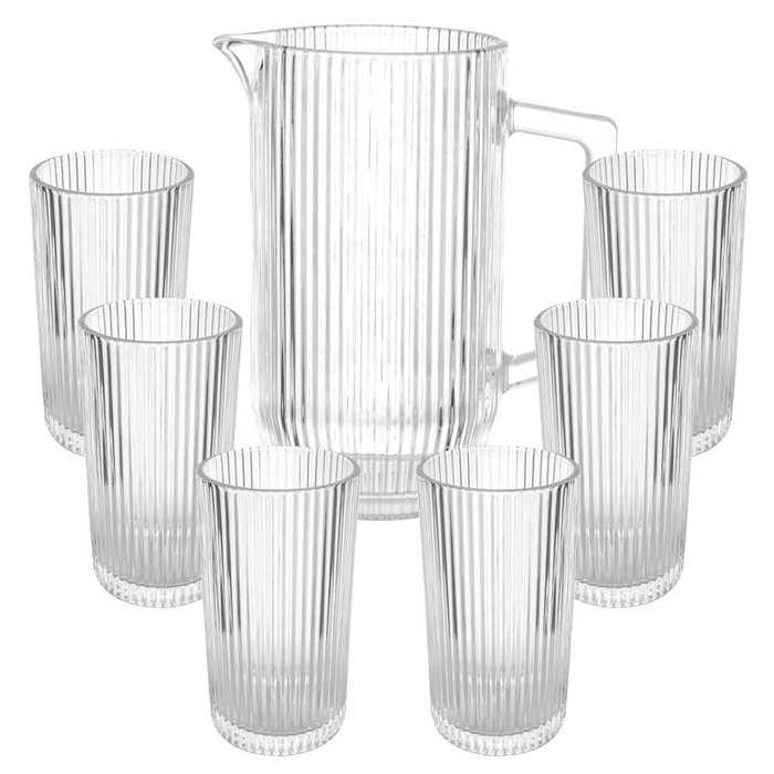 Os Copos e Jarra Graffiato da Hauskraft são produzidos em vidro, com desenhos em relevo listrados para você servir deliciosas bebidas com mais praticidade e requinte. Seu design minimalista, atemporal e elegante permite composições com outros itens em sua mesa ou cristaleira.