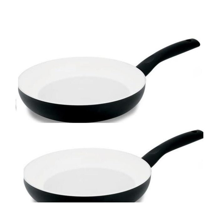 • 2 - Frigideira Diâmetro 24cm , Altura 4,5cm , Espessura 2mm Frigideira de Alumínio com revestimento antiaderente de cerâmica, cabo soft touch.