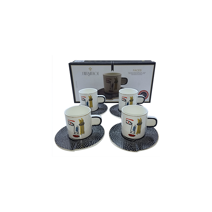 Desfrute do seu chá com estilo e sofisticação usando o Jogo de 4 Xícaras de Café com Pires Faces da L' Hermitage com borda dourada. Cada peça é feita em porcelana de alta qualidade, garantindo durabilidade e resistência, além de design exclusivo inspirado em arte moderna, que transforma o momento do café em uma experiência única e elegante.