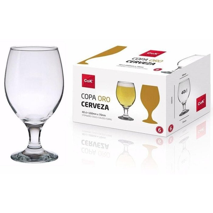 Jogo de 6 Taças Copa Oro Cerveja Capacidade de 400ml cada taça Material: Vidro Dimenções da taça: 16cm Altura x 6,5cm Diametro