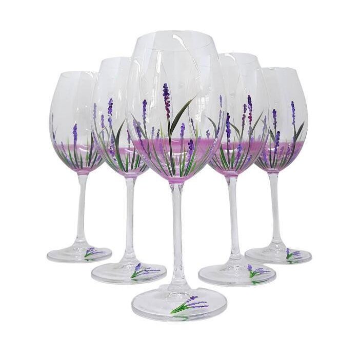 Jogo De 6 Taças de Cristal Pintadas À Mão Lavanda Taças de Cristal ideal para vinhos pintadas à mão com lindas lavandas. O Conjunto de Taças Para Vinho é perfeito para surpreender seus convidados ou até mesmo para aquele momento no aconchego de sua casa, Peça exclusiva. Ficha técnica - Bebidas recomendadas: Vinho - Cristal: Transparente - É produto personalizado: Sim - É adequado para lava-louças: Sim - Capacidade em volume: 580 ml Medidas do produto: -comprimento: 22,5 cm -altura: 25 cm -largura: 9,20 -peso total: 2 quilos Conservação e limpeza: lavar com a parte macia da esponja e sabão neutro. Não utilizar produtos abrasivos.