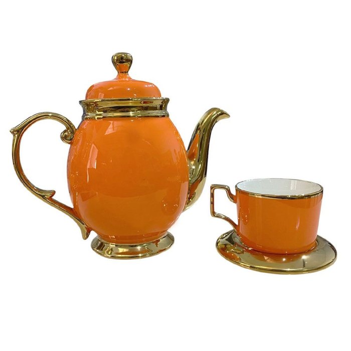Jogo de 6 Xícaras e Bule para Chá e Café Laranja com Detalhes Dourado