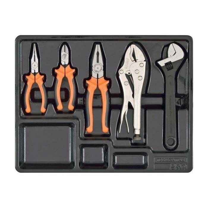 Os Jogos de Ferramentas Tramontina PRO, vêm em embalagens que funcionam como módulos (produzidos em plástico termo formado) e auxiliam, em uma melhor racionalização dos espaços, organização e produtividade. Foram projetados para encaixe perfeito nas gavetas dos carros organizadores da linha e estão disponíveis em várias composições e formatos. Porque não basta ter a ferramenta certa, é preciso ter ela sempre à mão. O Jogo é composto por Alicates - 5 Peças.