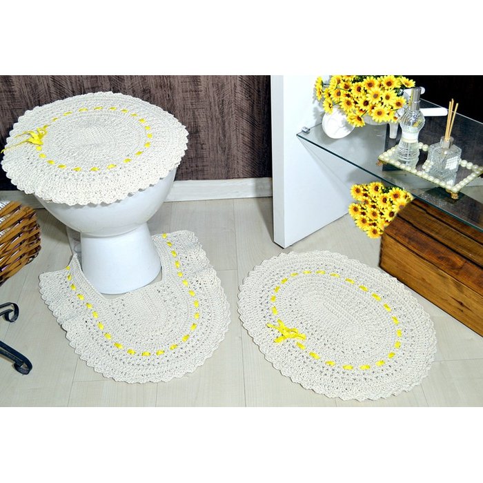 Jogo de Banheiro de Crochê - Lulu Lindo jogo de banheiro bordado que deixará seu banheiro um charme! Jogo de banheiro crochetado à mão em barbante, na cor cru, detalhes em fitas na cor amarelo. Olha que conjunto lindo para deixar seu banheiro bonito e sequinho! Esse excelente kit conta com peças confeccionadas om produtos de primeira qualidade para deixar sua casa um encanto! Nada de pés frios na hora de usar o banheiro, o que queremos é que você tenha conforto e comodidade em sua casa com produtos como esse, pensados para bem estar seu e de toda a sua família. Formado por: - 1 tapete 0,55 x 0,40m- 1 tapete contorno de vaso 0,45 x 0,40m- 1 tampa de vaso 0,45x 0,40m Composição: - 100% algodão