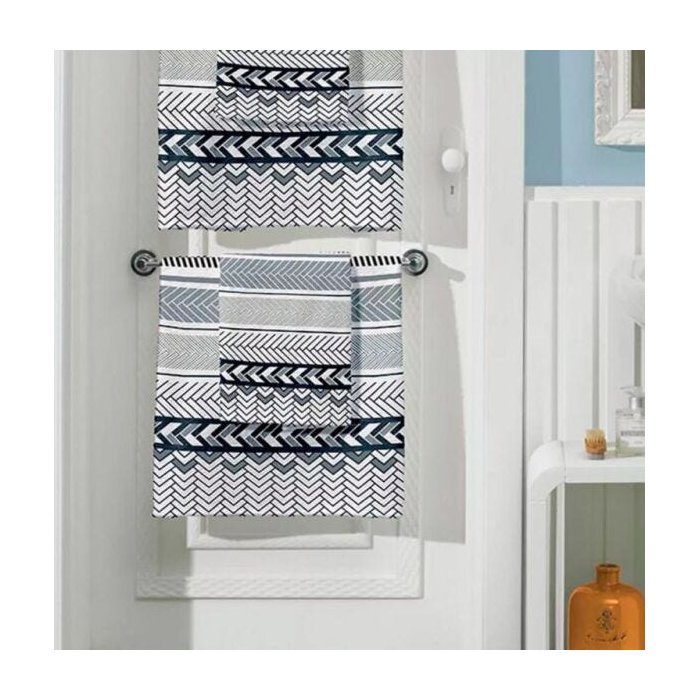 O jogo de toalhas felpuda Riviera possui uma sofisticada estampa de composição geométrica em tons de cinza e preto, sobre fundo branco.