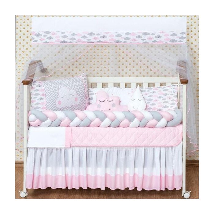 Jogo De Berço Menina Nuvem Trança 12 Peças Com Saia Rosa