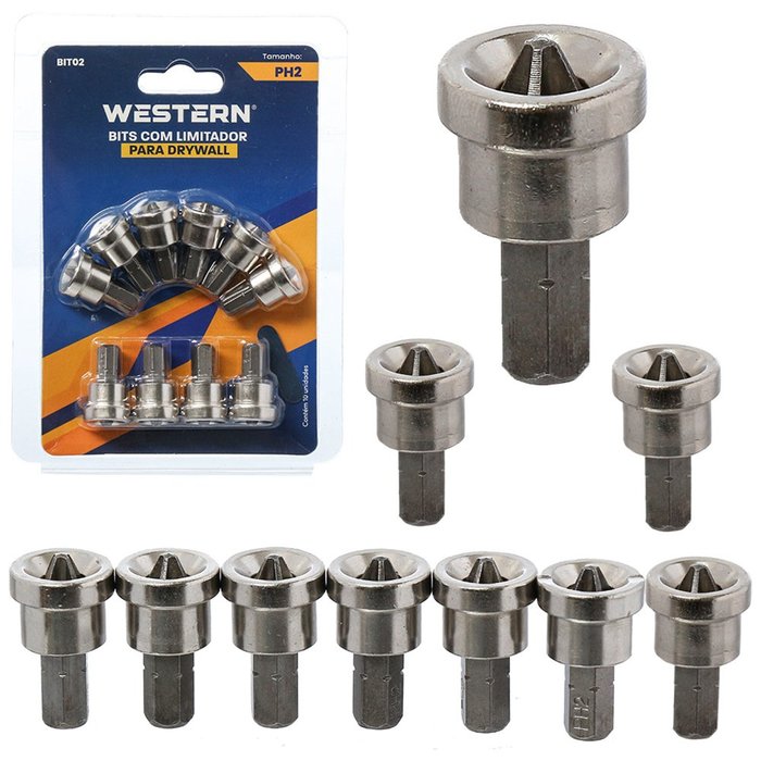 Jogo de Bits Phillips com Limitador para Drywall para Parafusadeira 10 Pecas Ph2