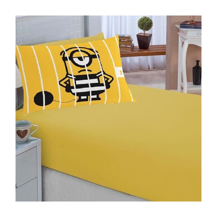 JOGO DE CAMA 2 PÇ- FRONHA ESTAMPADA+LENÇOL ELÁSTICO LISO PREMIUM - Minions Amar.