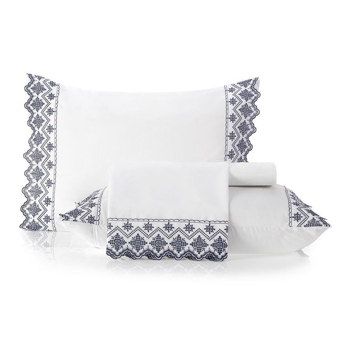 Confeccionado em tecido 100% poliéster de ultima geração com toque aveludado e maciez indescritível o Jogo de Cama Provence Azul Noite conta com aplicação de renda em tom azul nas fronhas e no lençol superior para deixar a decoração do seu quarto incrível.