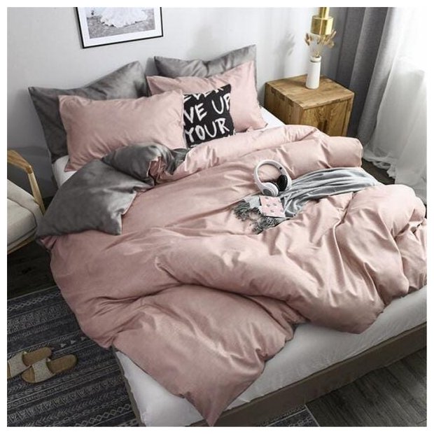 1 edredom dupla face de 2,40cm x 2,40cm - Um lado do edredom em rosê e o segundo lado em cinza.