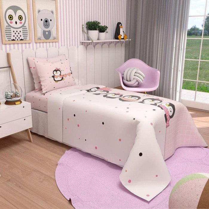 Jogo de Cama Infantil Poá Pinguim 4 peças - Tecido Microfibra 250 fios -