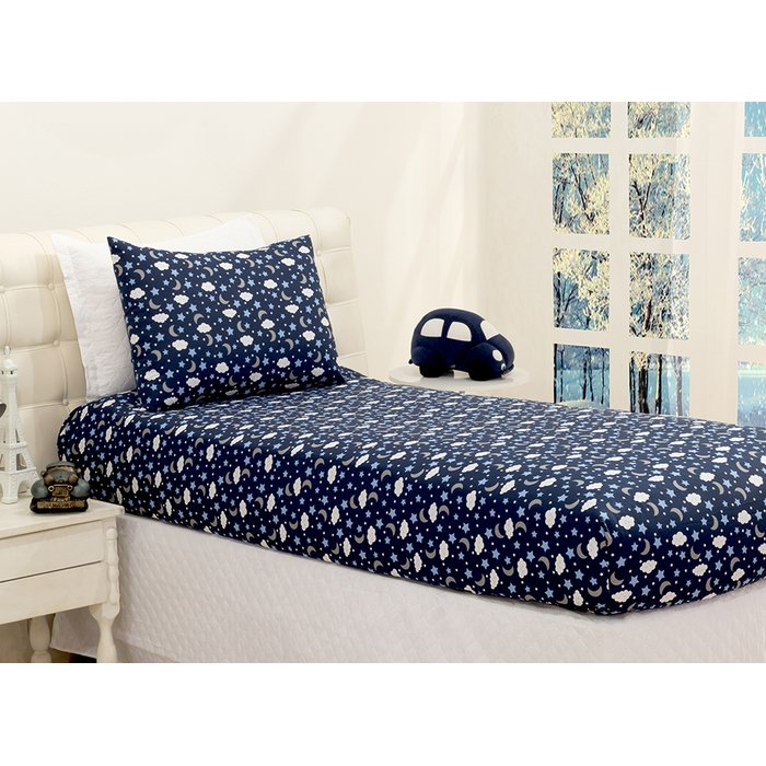 Jogo de Cama Lençol Solteiro Tricoline Algodão Estampado com Elástico 2 Peças Luar Azul Marinho