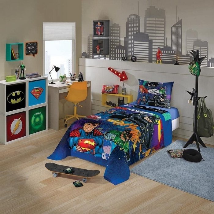 O jogo de cama da coleção Liga da Justiça ilustra os incríveis
