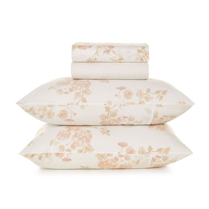 Lençol com suave estampa de ranhuras, fronhas e sobre lençol com estampa rotativa de flores com tons rosas