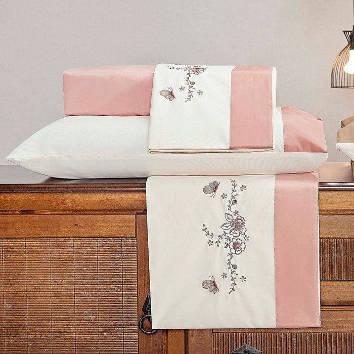 Jogo de Cama Queen Size 4 Peças 150 Fios Palha / Salmão com Detalhes Bordados