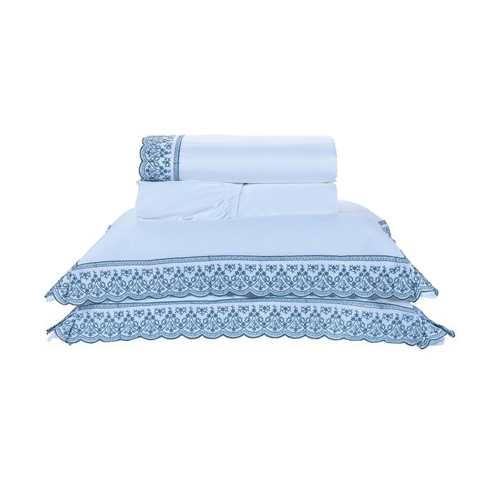 Jogo de Cama Queen Size Branco / Azul 400 Fios Egípcio 100% Algodão 4 Peças 2,60m x 2,40m