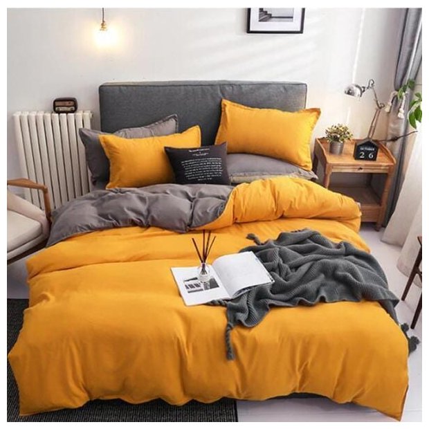 1 edredom dupla face com enchimento de 2,80x2,80 - 1 lado do edredom em amarelo e o segundo lado em cinza.