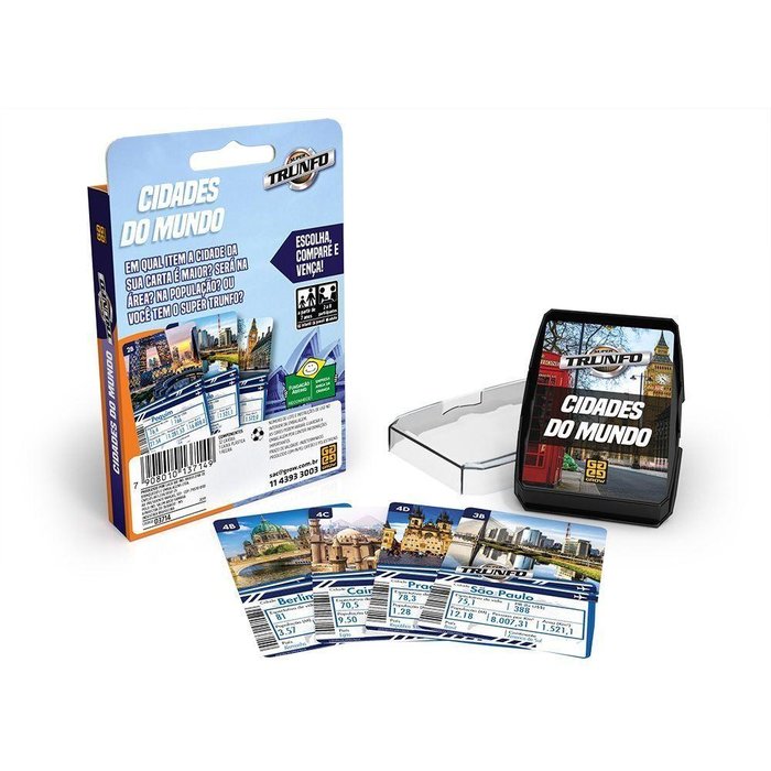 Jogo de Cartas - Super Trunfo - Cidades do Mundo - Grow: Super Trunfo Cidades do Mundo traz 32 cartas com ilustrações das principais cidades do mundo. Em qual item a cidade da sua carta é o melhor? Será ela é a mais populosa? A de maior área? Ou você tem o Super Trunfo? Escolha, compare e vença esta emocionante disputa!Super Trunfo Cidades do Mundo, o que é? Super Trunfo é um jogo de cartas muito divertido que consiste em tomar todas as cartas em jogo dos adversários por meio de escolhas de características de cada carta (velocidade, inteligência, defesa, habilidade e força). São 32 cartas divididas em 8 grupos de 4 cartas (1A, 1B, 1C, 1D, 2A, 2B… até 8A, 8B, 8C e 8D). Uma das cartas é o “Super Trunfo”, que ao entrar em disputa ganha de todas as cartas tipo B, C e D.- Como jogar Super Trunfo? - As cartas são embaralhadas e distribuídas. Cada jogador forma um monte em suas mãos, de tal modo que possa ver apenas a carta de cima. Começa o jogo quem estiver à esquerda do jogador que distribuiu as cartas. - Ele escolhe uma das características da sua carta de cima e a lê em voz alta. Depois, os jogadores leem, cada um na sua vez, o valor correspondente a esta característica na sua carta de cima. - Ganha aquele que tiver o maior valor. O vencedor da rodada recebe as cartas dos outros jogadores, coloca-as, com as a sua primeira carta, atrás do seu monte e escolhe uma característica na carta que agora está em cima.- Super Trunfo - regras para empate: - Se dois ou mais jogadores possuírem cartas com o mesmo valor, os demais deixam suas cartas na mesa, e a vitória é decidida entre os que empataram. - Para isso, quem escolher inicialmente escolhe outra característica da próxima carta. Ganha todas as cartas da rodada quem tiver o valor mais alto.- Carta Super Trunfo: - A carta Super Trunfo é embaralhada com as demais. Suas informações superam as características de todas as cartas marcadas com B, C e D, sem levar em consideração os valores. - Ela perde apenas se um dos jogadores tiver uma carta marcada com a letra A.- Vencedor: - Vence o jogador que ficar com todas as cartas do baralho.Informações:- Produto: Jogo Super Trunfo - Paises- Marca: Grow- Tipo: Jogo de Cartas- Jogadores: de 2 a 8 participantes- Categoria: Infantil e Juvenil- Tempo estimado de jogo: 20 minutos - Conteúdo: - 01 baralho com 32 cartas- 01 manual de instruções - 01 caixinha plástica - Recomendação: para crianças a partir de 07 anos de idadeEspecificações:- Referência: 03714- Código de Barras: 7908010137149- Embalagem (C x A x L): 10 x 15.2 x 02 cm- Embalagem (Peso): 0.090 kg- Material / Composição: papel cartão e poliestireno- Registro: CE-BRI/ICEPEX-N 01264-25- Certificado: Órgãos Autorizados - OCP´S (Organismos de Certificação de Produtos)Benefícios de jogar:- Eleva a autoestima- Exercita a memória- Estimula o raciocínio- Exercita o imaginário- Desenvolve a criatividade- Desenvolve percepção visual- Desperta a atenção e curiosidade- Desenvolvimento neuropsicológico- Estimula habilidades motoras básicas- Incentiva a comunicação e linguagem- Desenvolve aspectos emocionais e afetivo- Estimula o reconhecimento de formas e coresAviso: - As imagens são meramente ilustrativas- Os pesos, tamanhos e medidas são aproximados- As cores e estampas dos produtos podem ter variações- As informações são de responsabilidade do fabricante ou fornecedor