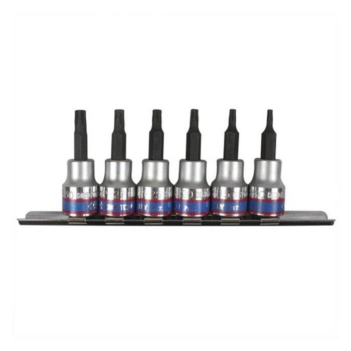 Jogo de chave torx com 5 pontas e com guia. Fabricado em aço cromo vanádio e acabamento superficial cromado e polido. Marca: King Tony Características: -Material: Aço cromo vanádio. -Acabamento superficial cromado e polido. -Possui furo liga (central). -Encaixe: 3/8". Conteúdo: -1 Soquete torx T10. -1 Soquete torx T15. -1 Soquete torx T20. -1 Soquete torx T25. -1 Soquete torx T27. -1 Soquete torx T30. -1 Suporte para organização. Aplicação: Indicado para parafusos especiais e utilizado em conjunto com acessórios manuais. Código: 3146PR