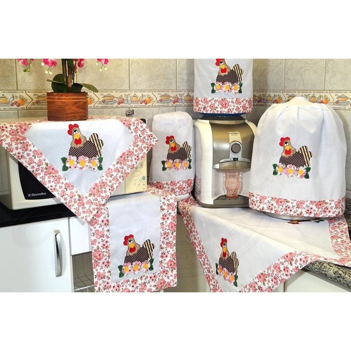Jogo de Cozinha Bordado Patchwork - Galinha Barrado Florido RosaEsse kit maravilhoso vai deixar sua casa com charme especial! Jogo fabricado com tecido de tergal na cor branco, com barrado na cor rosa floral em todas as laterais das peças, formado por 6 peças, com bordado de uma linda galinha colorida em patchwork.Para renovar a decoração de sua casa de forma simples e funcional é possível utilizar uma técnica clássica, utilizada em residências típicas brasileiras. O jogo de cozinha possui beleza e delicadeza . Não há uma regra a seguir para decorar sua cozinha ou copa, com esse modelo o ambiente fica mais charmoso, além de serem práticos no dia a dia e assim deixando sua casa mais bonita. Formado por: - 1 capa galão- 1 capa botijão- 1 capa liquidificador- 1 toalha centro 0,75 x 0,75m- 1 caminho 1,00 x 0,40m- 1 bandeja 0,45 x 0,45 m Composição:- 67% poliéster- 33% algodão