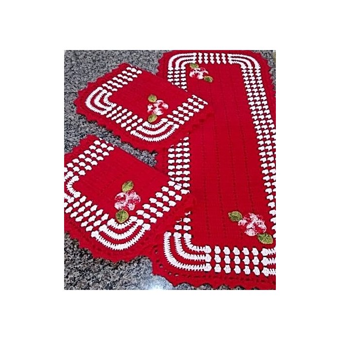 Jogo de Cozinha de Crochê Floral Retangular - 3 Peças