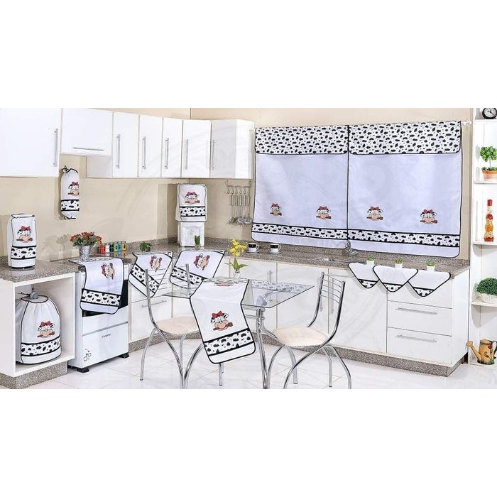 Kit formado por 12 peças, em tecido tergal na cor branca, com barrado em tecido preto e branco, uma linda vaquinha bordada em patchwork nas cores branco, preto, bege, marrom e vermelho, detalhes em viés na cor pretoA Arte & Tear está sempre pensando na praticidade, aliada à decoração do lar. E foi desta forma que nasceu esse lindo jogo para sua cozinha. O jogo traduz o dia a dia da cozinha de uma forma simpática e divertida, através de desenhos exclusivos e inspirados no cotidiano deste lugar, muitas vezes colocado de lado na hora de decorar. Além de embelezar seu espaço permite maior segurança evitando possíveis riscos nos móveis e utensílios da sua cozinha durante o preparo de alimentos. Formado por:1 - Capa de botijão bordado patchwork 1 - Capa de liquidificador bordado patchwork1 - Capa de galão 20 l bordado patchwork 1 - Caminho de mesa bordado patchwork 1,20 x 0,37 m3 - Toalha de bandeja 0,30 x 0,30 m1 - Puxa saco bordado bordado patchwork1 - Cortina de cozinha bordado patchwork 2,00 x 1,20 m1 - Caminho de balcão bordado patchwork 0,70 x 040 m2 - Caminho bordado patchwork 0,60 x 0,37 m Composição:- 67 % Poliéster