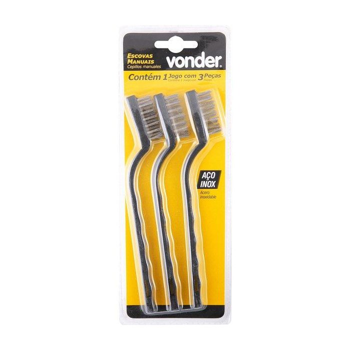 Marca: VonderConteúdo da Embalagem:1 Jogo com 3 escovas manuais iguais, de aço inox com cabo de 175 mm de comprimentoDestaques e diferenciais:Possui facilidade de limpeza em locais de difícil acessoAplicações e dicas de uso:Indicado para limpeza de peças em geralCaracterísticas Técnicas:Número de peças do jogo para limpeza: 3 peças