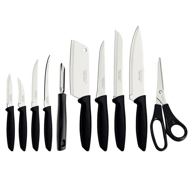 Sua cozinha ganhará maior funcionalidade e versatilidade com o jogo de facas Tramontina Plenus com lâminas em aço inox e cabos de polipropileno preto 10 peças. Com peças essencias para o preparo das suas refeições do dia a dia, como facas, cutelo, descascador e tesoura, ele vai deixar o preparo de suas receitas ainda mais fácil. As lâminas das peças são produzidas em aço inox com tratamento térmico e cabos de polipropileno, garantem alto poder de corte, resistência e maior durabilidade. Um jogo que ainda pode ser levado à máquina de louças e que vai facilitar suas tarefas, seja na hora de cozinhar ou limpar!