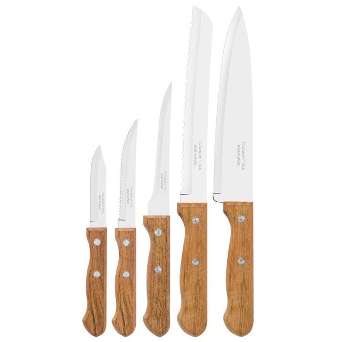 Com cabos de madeira natural e rebites de alumínio, as facas da Linha Dynamic levam rusticidade e beleza às refeições informais. A qualidade das peças é garantida também pela espessura e formato das lâminas de aço inox. As lâminas das facas recebem tratamento térmico, resultando em maior resistência e durabilidade do fio de corte. ESPECIFICAÇÕES: Marca: Tramontina Linha de Produtos: Dynamic Referência: 22399/082 Medida do produto: xx cm (Comprimento x Profundidade x Altura) Peso do produto: 0,3 kg Ítens inclusos: 1 faca chef 8", 1 faca para churrasco 4", 1 faca para desossar 5", 1 faca para legumes 3", 1 faca para pão 8" Material (Composição): Lâminas de aço inox. Cabos de madeira natural. Rebites de alumínio. Outras informações: Antes da primeira utilização, lave bem as peças e seque-as. Tenha cuidado ao manusear produtos cortantes e perfurantes e mantenha-os fora do alcance de crianças. Para maior durabilidade dos produtos, recomenda-se secar bem antes de guardar. Para descarte dos produtos e embalagens siga as orientações de reciclagem vigentes.