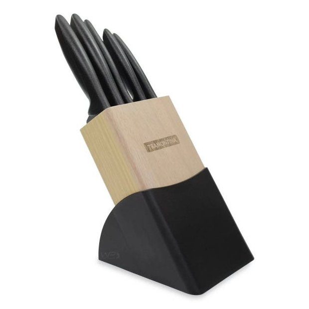 Contar com produtos práticos e elegantes na cozinha tornam o momento de cozinhar muito mais prazeroso. Dono de uma beleza incrível este item é perfeito para manter a organização e praticidade no ambiente, com quatro facas, um garfo e um suporte, seus talheres ficam sempre à mão. Material robusto e durável com as lâminas em aço inox para a não oxidação das peças, o suporte possui o encaixe perfeito para cada talher evitando acidentes pois apenas os cabos ficam expostos. Cada talher com sua função expecífica facilita os preparos além de ser um item charmoso e uma bela opção pra complementar a linda decoração de sua cozinha! Benefícios do Produto • Modelo charmoso e elegante que embeleza sua cozinha • Evita acidentes pois apenas os cabos ficam à mostra • Material robusto de alta durabilidade e resistência • Talheres devidamente separados protegendo e prolongando a afiação das lâminas • Facas sempre à mão e organizadas • Tamanho ideal para posicionar em cima da bancada ou pia • Uma ótima opção para presentear alguém especial Especificações do Produto • Material Suporte: Madeira e Plástico Polipropileno • Material Cabos das Facas: Plástico Polipropileno Preto • Material Lâminas: Aço Inox • Possui 5 encaixes para facas • Dimensões Suporte - Altura: 18,5cm/Largura: 12,5cm/Comprimento: 14,5cm • Dimensões Faca P/ Legumes - Altura: 1,4cm/Largura: 2,1cm/Comprimento: 18,6cm • Dimensões Faca P/ Desossar - Altura: 1,8cm/Largura: 3,1cm/Comprimento: 26,2cm • Dimensões Faca Chef - Altura: 1,8cm/Largura: 4,2cm/Comprimento: 29,9cm • Dimensões Faca P/ Tomate - Altura: 1,3cm/Largura: 2,1cm/Comprimento: 23,1cm • Dimensões Garfo - Altura: 1,6cm/Largura: 2,3cm/Comprimento: 26,1cm Informações Adicionais • Garantia: 90 dias contra defeito de fabricação Conteúdo na Embalagem • 01 Faca Para Legumes/Frutas, 01 Faca Para Desossar, 01 Faca Chef, 01 Faca Para Tomate, 01 Garfo Trinchante e 01 Suporte de Madeira