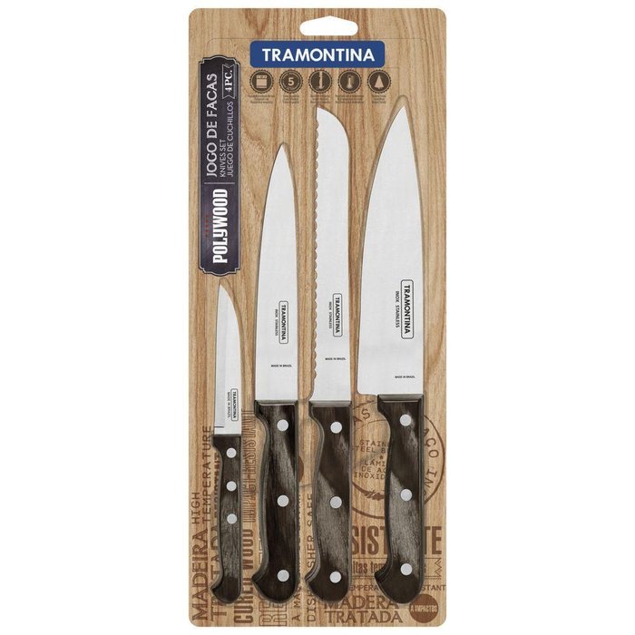 Jogo De Facas Tramontina Polywood Com Laminas Em Aço Inox E Cabos De Madeira Castanho 4 Peças