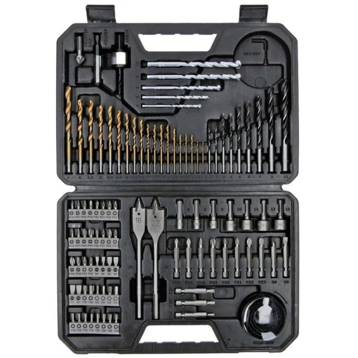 O Kit é composto por 19 brocas para metal HSS-TiN de 1,5-7mm, 5 brocas para pedra em metal duro de 4-10mm, 9 brocas para madeira de 3-10mm, 2 brocas de fresa plana de 16/22mm, 40 pontas parafusadoras de 25mm PH 0/0/1/1/2/2/2/3/3/3, PZ 0/0/1/1/2/2/2/3/3/3, SL 4/4/6/6/7/7; HEX 3/4/5/6, T 10/10/15/15/20/20/25/25/30/40, 13 pontas aparafusadoras de 50mm PH 0/1/2/3, PZ 0/1/2/3, SL 4/6, T 10//20/25, 7 chaves de caixa de 5/6/8/10/11/12/13mm, 4 serras copo HCS de 32/38/44/54mm, 1 adaptador para serra craneana, 1 chave Allen, 1 suporte universal magnético e 1 escareador.