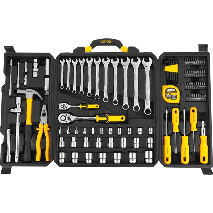 Marca: Vonder Conteúdo da embalagem: 1 Jogo de ferramentas, composto por 110 peças, sendo: 1 maleta plástica, 1 porta-chaves allen/hexagonais, 4 porta-bits, 1 alicate universal 8", 1 martelo 20,0 mm, 1 trena 5,0 m, 2 chaves de fenda (5,0 mm x 75,0 mm e 6,3 mm x 100,0 mm), 2 chaves phillips (5,0 mm x 75,0 mm e 6,3 mm x 100,0 mm), 8 chaves allen/hexagonais (1,5 mm, 2,0 mm, 2,5 mm, 3,0 mm, 4,0 mm, 5,0 mm, 5,5 mm e 6,0 mm), 11 chaves combinadas (8,0 mm, 9,0 mm, 10,0 mm, 11,0 mm, 12,0 mm, 13,0 mm, 14,0 mm, 15,0 mm, 17,0 mm, 18,0 mm e 19,0 mm), 15 soquetes sextavados encaixe 1/2" (10,0 mm, 11,0 mm, 12,0 mm, 13,0 mm, 14,0 mm, 15,0 mm, 17,0 mm, 18,0 mm, 19,0 mm, 20,0 mm, 21,0 mm, 22,0 mm, 23,0 mm, 24,0 mm e 27,0 mm), 1 catraca encaixe 1/2", 1 extensão 5" encaixe 1/2", 1 junta universal encaixe 1/2", 1 cabo T encaixe 1/2", 2 soquetes para vela de ignição (16,0 mm e 21,0 mm), 11 soquetes sextavados encaixe 1/4" (4,0 mm, 5,0 mm, 6,0 mm, 7,0 mm, 8,0 mm, 9,0 mm, 10,0 mm, 11,0 mm, 12,0 mm, 13,0 mm e 14,0 mm), 1 catraca encaixe 1/4", 1 extensão 2" encaixe 1/4", 1 extensão 4" encaixe 1/4", 1 extensão flexível 6" encaixe 1/4", 1 junta universal encaixe 1/4", 1 cabo adaptador para bits com catraca encaixe 1/4", bits magnéticos encaixe 1/4": 7 fenda (3,5 mm (2 peças), 4,0 mm (2 peças), 5,5 mm, 6,5 mm e 8,0 mm), 8 phillips (N°0, N°1, N°2 e N°3 (2 peças cada)), 6 allen (2,0 mm, 3,0 mm, 4,0 mm, 5,0 mm, 6,0 mm e 7,0 mm), 3 quadrados (S1, S2 e S3), 7 hexalobular (T10, T15, T20, T25, T27, T30 e T40), 3 pozidrive (PZ1, PZ2 e PZ3), 4 três pontas (1, 2, 3 e 4) e 2 adaptadores. Destaques e diferenciais:Proporciona maior praticidade, pois com apenas 1 jogo de ferramentas é possível realizar uma série de trabalhos. Acompanha maleta com encaixe perfeito dos acessórios, conferindo organização, praticidade e maior vida útil às ferramentas. Dicas de uso:Indicado para manutenções e reparos em geral. Detalhes Técnicos:Nº de peças: 110 peças