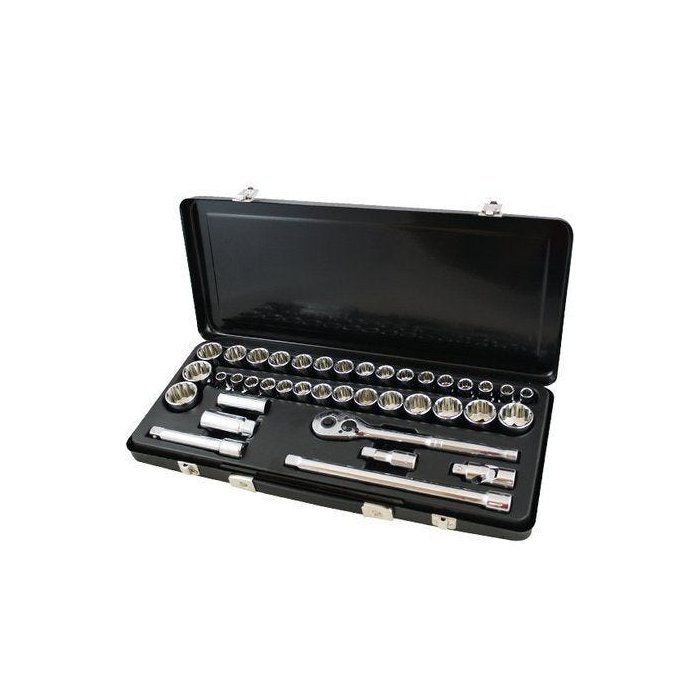 - 14 soquetes SAE estriados de 1/2" - 3/8"; 7/16"; 1/2"; 9/16"; 5/8"; 11/16"; 3/4"; 13/16"; 7/8"; 15/16"; 1"; 1.1/16"; 1.1/8"; 1.3/16"