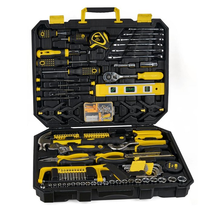 Jogo de ferramentas 168 pcs CRV e aço carbono Conteúdo da Embalagem 4 Chaves de Fenda PH2x38,2x100, SL6x38, 6x100mm 1 Porta Bits Catraca 1 Trena de 3M 6 Chaves Combinadas 8,10,12,13,14,15mm 1 Barra extensora 3/8" 1 Extensão 3/8" 1 Chave Catraca 3/8" 5 Chaves de precisão PH000,00,0, SL2.4,3.0 1 Nível 9" 4 Grampos 3" 20 Bits 25L 1 Alicate Desencapador 7" 1 Martelo Unha 23mm 1 Chave Ajustável 8" 1 Alicate Bomba D'Água 8" 1 Alicate Universal 6" 1 Alicate de Bico Fino 6" 9 Chaves Allen 15-10mm 1 Fita Isolante 5M 1 Porta Bits Magnéticos 60mm 1 Serra Manual 6" 10 Bits 50L 1 Adaptador 1/4" (M)x 3/8" (F) 12 Soquetes 1/4" 4,4.5,5,5.5,6,7,8,9,10,11,12,13mm 10 Soquetes 3/8" 10,11,12,13,14,15,16,17,18,19mm 71 Fixadores 1 Maleta