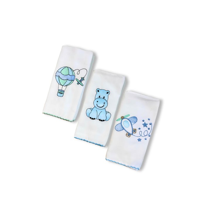 1 Fralda de boca bordado Balão 1 Fralda de boca bordada Hipopótamo 1 Fralda de boca bordado Avião com estrelinhas Tecido: Fralda 100% AlgodãoOutras informações: