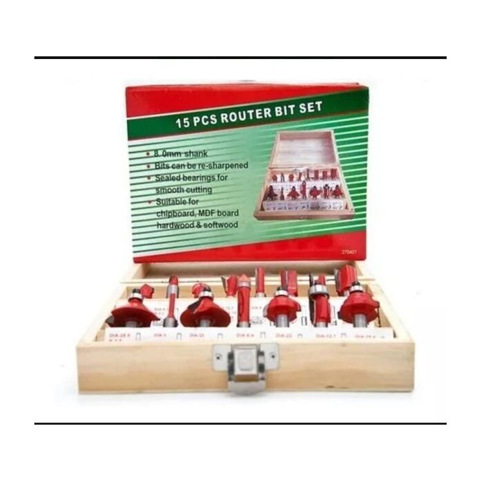 Jogo de Fresas em metal duro / vídea para Madeira com haste 6mm e 15 Peças. Fresas reta, com rolamento, para rasgo em V e U, moldura, chanfro, etc.