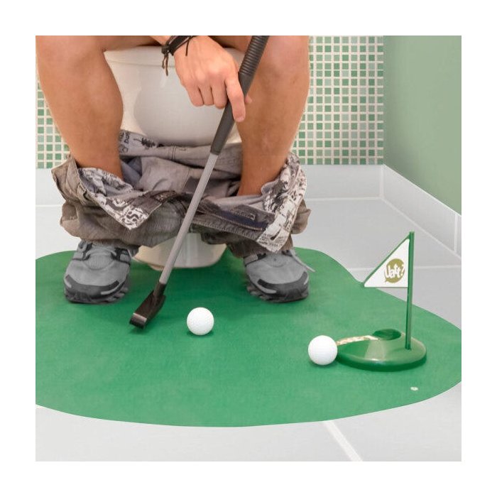Divertido jogo de golf pra se divertir até na hora de ir ao banheiro! Ideal pra quem quer levar a descontração e diversão a qualquer hora! O jogo possui um tapete, um buraco plástico com bandeirinha, uma taco com cabo retrátil, duas bolas de golf e pra completar, um aviso de porta que vai arrancar muitas risadas.