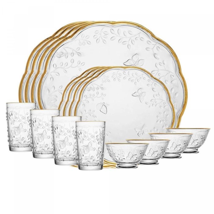 Jogo de Jantar 16 Peças New Butterfly Fio de Ouro Cristal Transparente