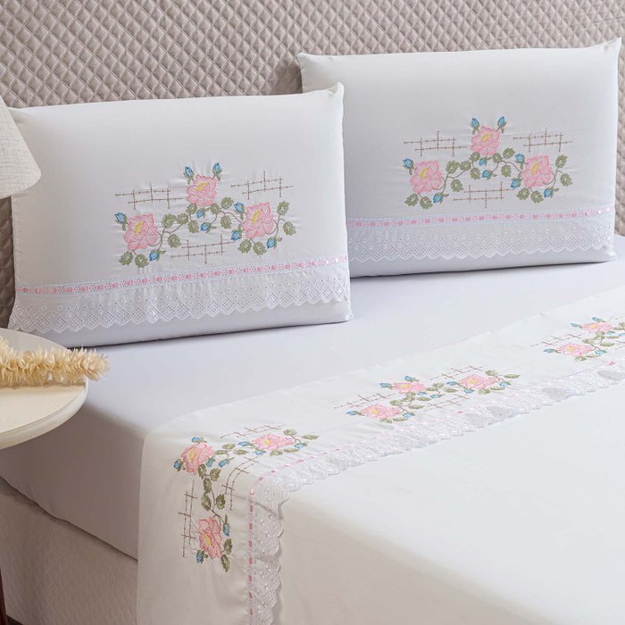 Jogo de lençol com bordados refinados vai deixar seu quarto lindo! Charmoso e aconchegante, o modelo elegante trás conforto e um toque romântico para o ambiente, macio e acabamento diferenciado ajudam a trazer a delicadeza da peça e deixa seu ambiente ainda mais agradável melhorando a qualidade do sono e aumentando a sensação de bem estar.
