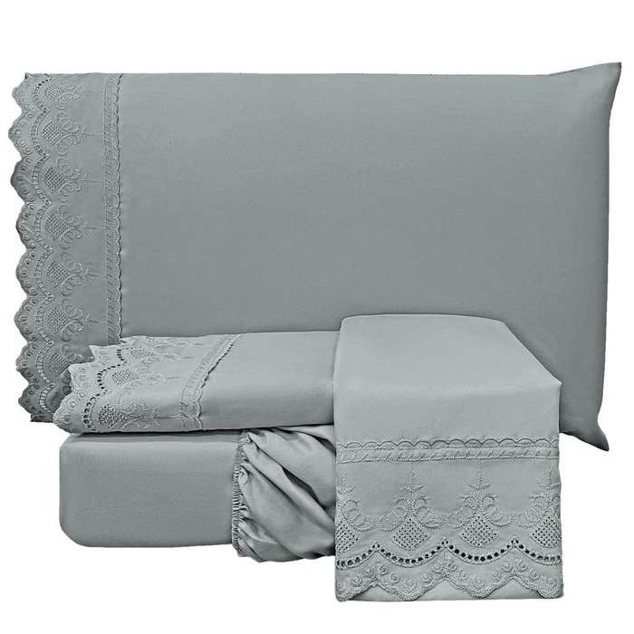 Jogo de Lençol Casal Bordado Inglês Lauren 3 Peças Chumbo