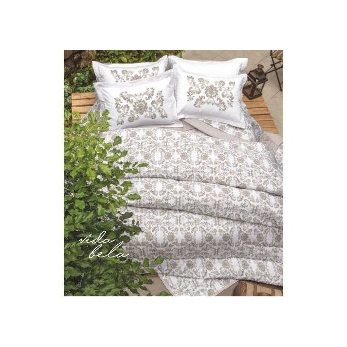Jogo de cama casal Vida Bela - Kacyumara. O conforto e qualidade que representam esse Jogo de cama, muito macio e confortável ele vai te proporcionar as melhores noites de sono. Fabricado em 100% algodão possui um toque muito macio e delicado, sua trama elaborada em Percal 200 Fios garante mais durabilidade do seu produto e proporciona uma sensação aconchegante. Com tons neutros e estampa romântica, o Jogo de cama Vida Bela irá harmonizar muito bem com seu quarto. Contém 1 Lençol Vira 1 Lençol elástico 2 Fronhas. Medidas: Lençol Vira 2,20 m x 2,50 m Lençol Elástico 1,40 m x 1,90 m x 30 cm Fronhas 50 cm x 70 cm.