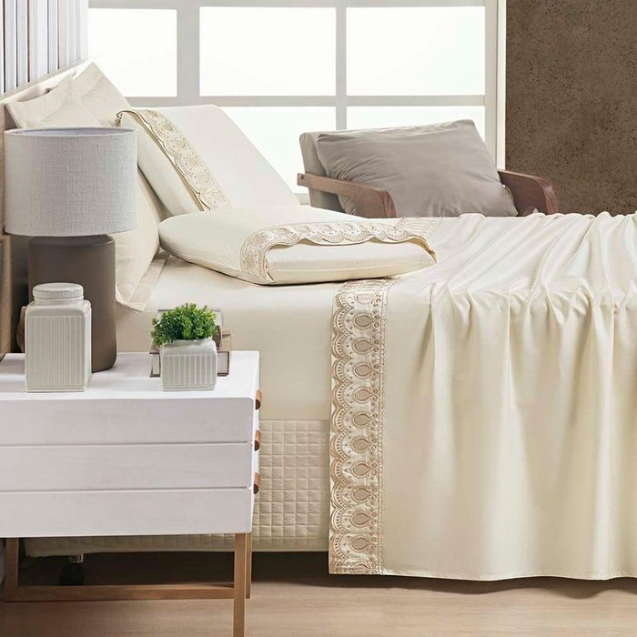 Jogo De Lençol Luxo Casal Padrão 4 Peças Percal 400 Fios 100% Algodão Fio Egípico Acetinado - Vanilla