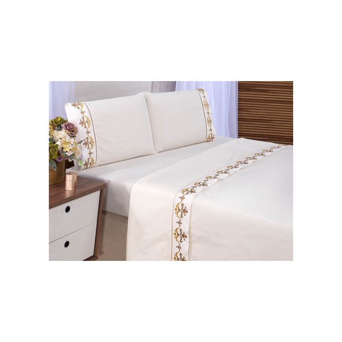 Jogo de Lençol Casal Padrão 400 Fios Bordado Realeza Palha 4 Pçs.