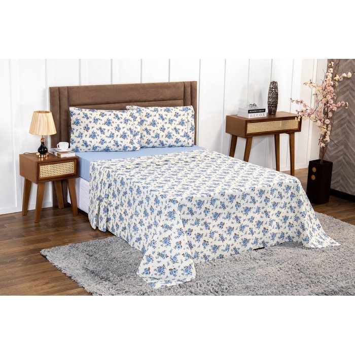 Jogo de Lençol King 4 Peças 180 Fios Algodão Estampado:florzinha-azul