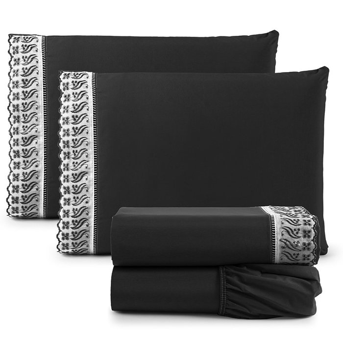 Jogo de Lençol King Suave Barrado Lese 4 Peças Barato - Preto Casa Show Enxovais