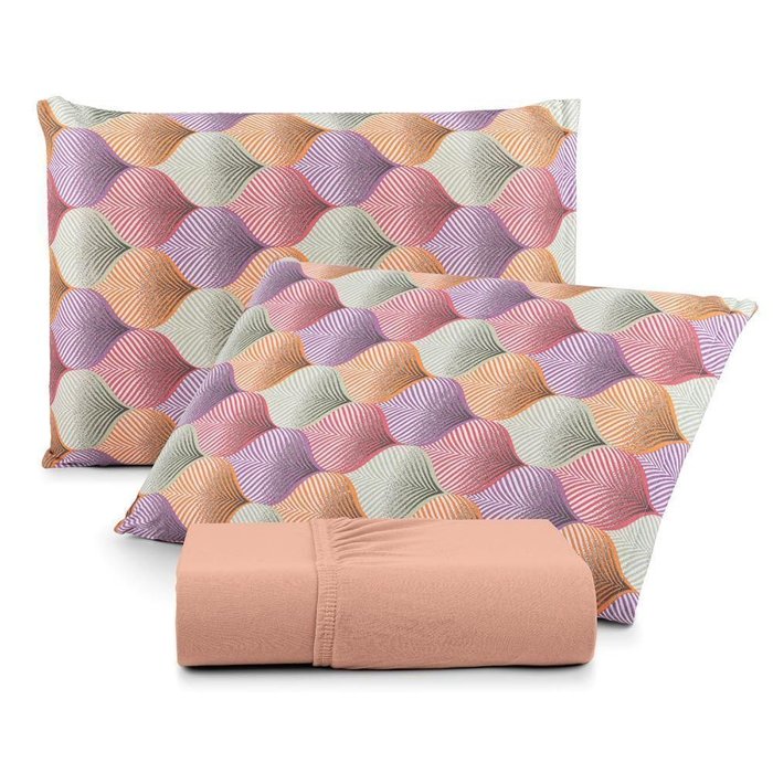 Jogo de Lençol Luar Casal 3 Peças Malha 100% Algodão Estampado Salmão Geométrico