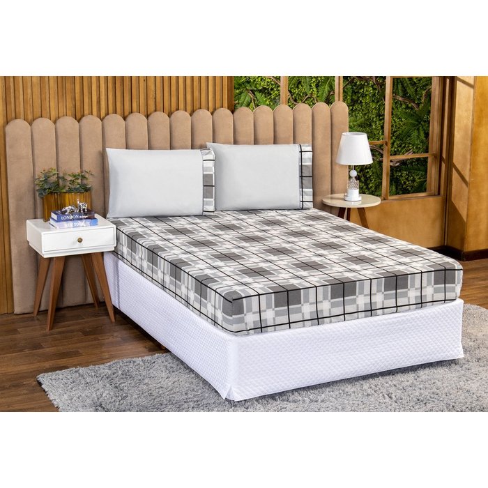 Jogo de Lençol Solteiro 3 Peças 180 Fios Algodão Estampado:xadrez-cinza XADREZ-CINZA